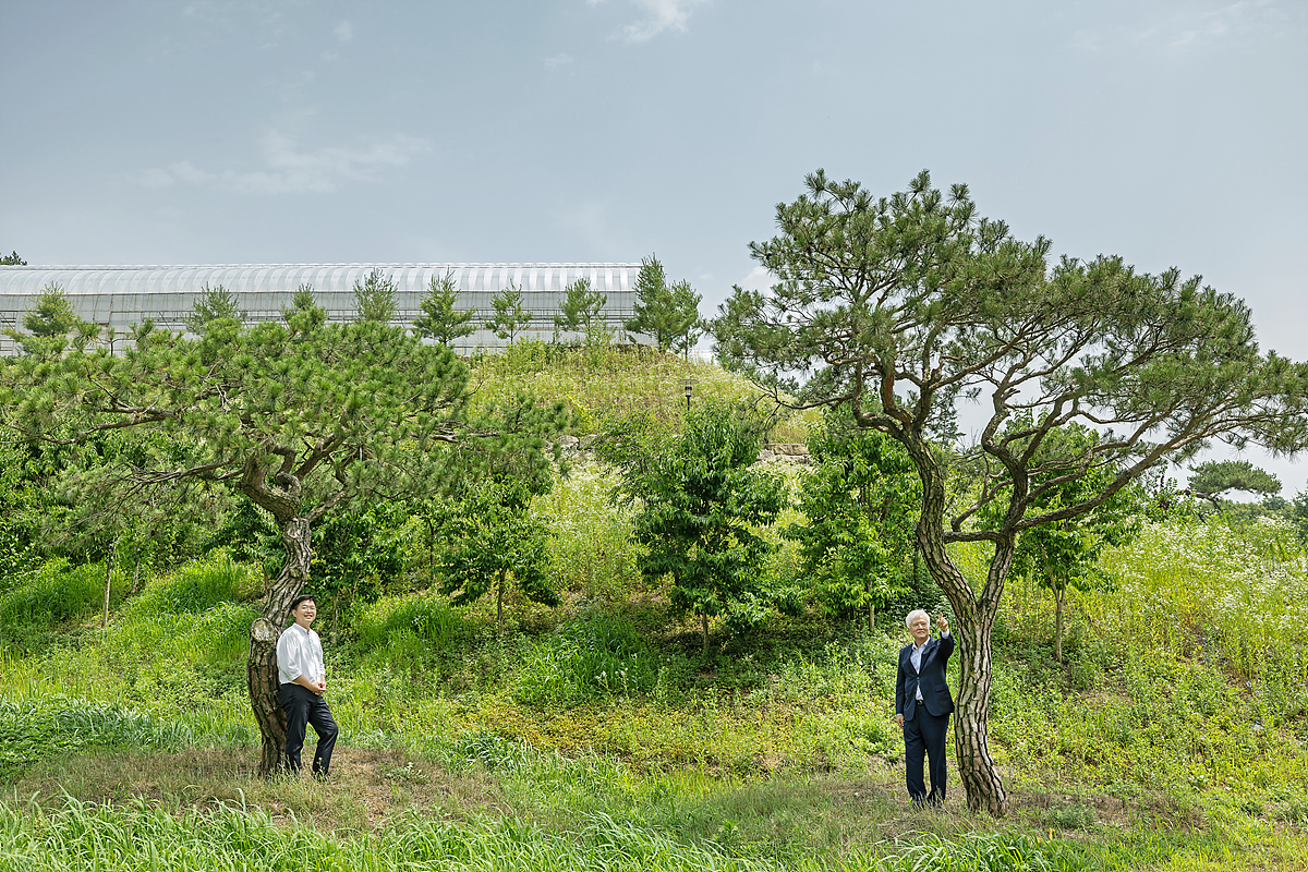 장원조경 농장 한편에서 먼 산을 가리키며 앞으로의 파트너십을 다잡는 신경준 대표이사와 최찬 과장